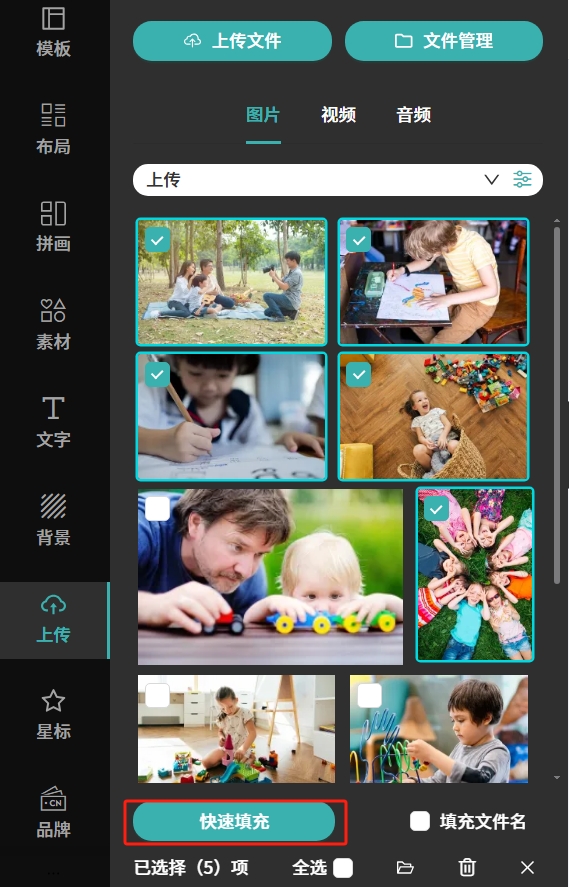 1. 在编辑区域上,框选或按住 Shift 键点选所有需要参与拼画的照片。