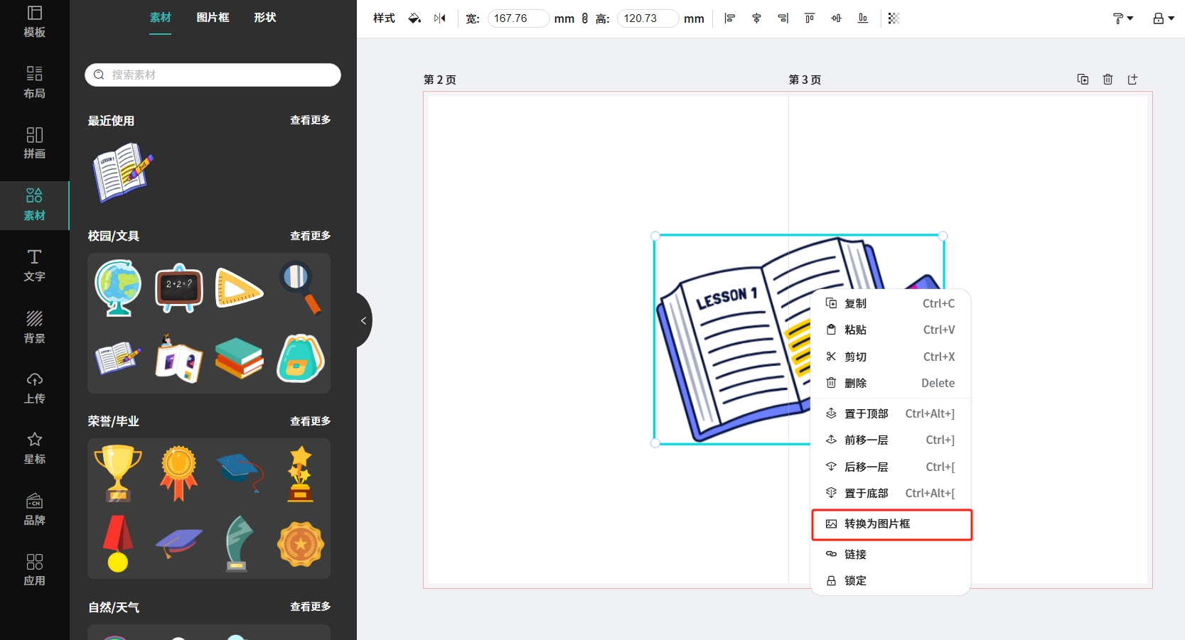 2. 在素材上右击,点击 “转换为图片框” 。 元素即被转换为图片框,可直接拖入图片进行填充。